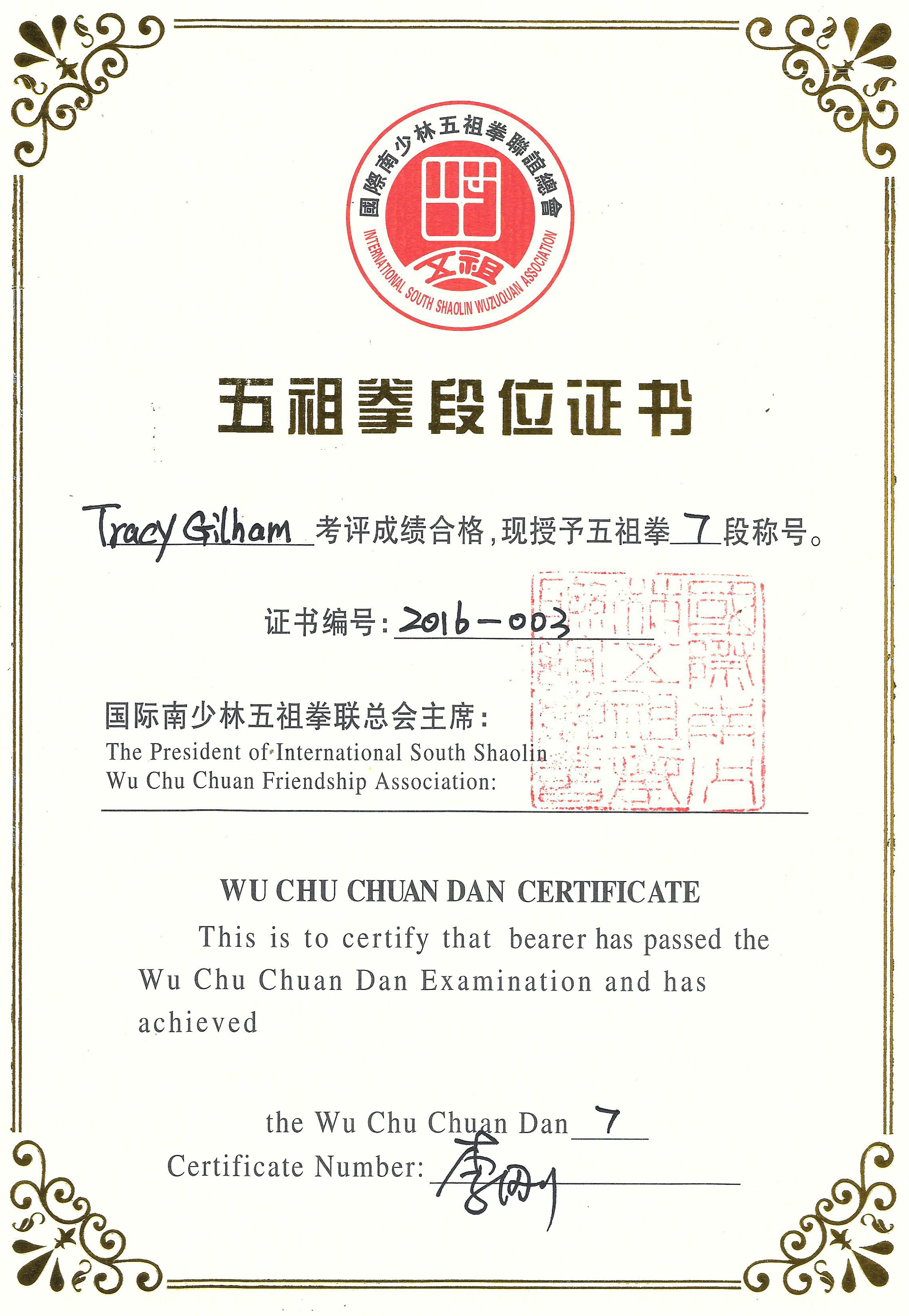 • 7th Dan Black Sash, Nan Shaolin Wuzuquan (graded under Grandmaster Kim Han). Presented in China in November 2016